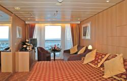 - kajuta s balkonem (výhled na moře, 27m2) – soukromý balkon, koupelna s vanou, TV/SAT, rádio, klimatizace, telefon, prostorná šatní skříň, připojení k internetu (nutný vl. PC, za poplatek), minibar, trezor, fén, velká manželská postel, která jde změnit na 2 postele pro jednu osobu.