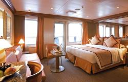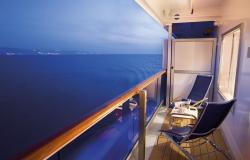 • kajuta s balkonem (výhled na moře, 20 m2), WC/sprcha, TV/SAT, rádio, klimatizace, telefon, připojení k internetu (nutný vl. PC, za poplatek), mini bar, trezor, fén, velká manželská postel, která jde změnit na 2 postele pro jednu osobu