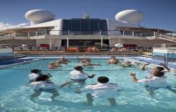• Celebrity Silhouette - Celebrity Cruises - bazén na horní palubě u baru a lidé hrající volejbal