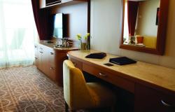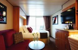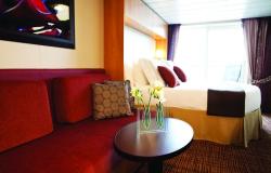 • kajuta s balkonem: WC/sprcha, interaktivní TV/SAT/Pay-Per-View, rádio, klimatizace, telefon, mini bar (za poplatek), trezor, fén, velká manželská postel, která jde změnit na 2 postele pro jednu osobu, župan, zásuvky 110/220 V, bezplatný room service