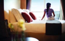 • Celebrity Silhouette - Celebrity Cruises - žena sedící na manželské posteli v suitě kajutě